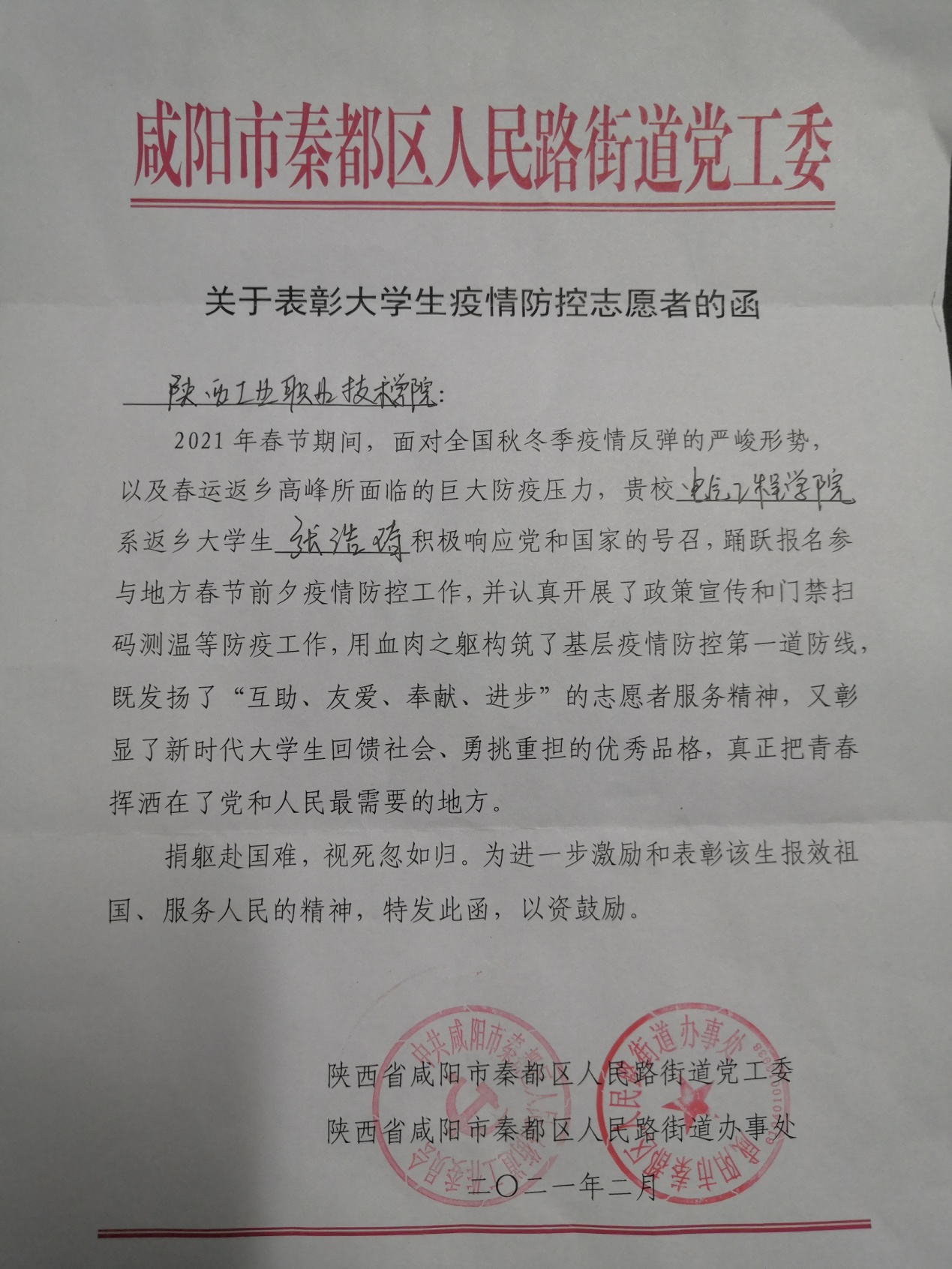 近日,我院收到咸阳市秦都区人民路街道党工委发来关于表彰大学生疫情防控志愿者的函,表扬电气自动化技术2006班同学张浩琦积极主动加入疫情防控志愿服务队伍,为当地疫情防控工作做出奉献,并对我院人才培养的努力给予了感谢。