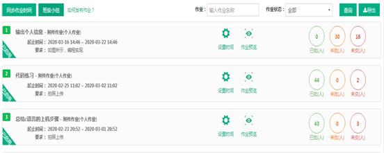 根据课程进度及内容安排,3周课程共进行了3次作业布置,老师均能按时对作业进行批阅并通过QQ群反馈作业问题。个别同学因为网络或平台时限等原因未能及时完成作业的,授课教师通过授课微信群、QQ群等及时督促提醒,促使学生保质保量完成作业。