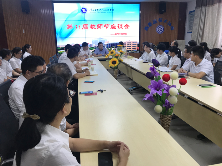 9月9日下午,在第35个教师节即将到来之际,电气工程学院在行知A四楼智能微电网实训室举行庆祝教师节座谈会。联系电气工程学院的院领导学院副书记副院长刘永亮及电气工程学院全体教师欢聚一堂,面对面聆听教师心声,共话高职教育发展。座谈会由电气工程学院院长夏东盛主持。