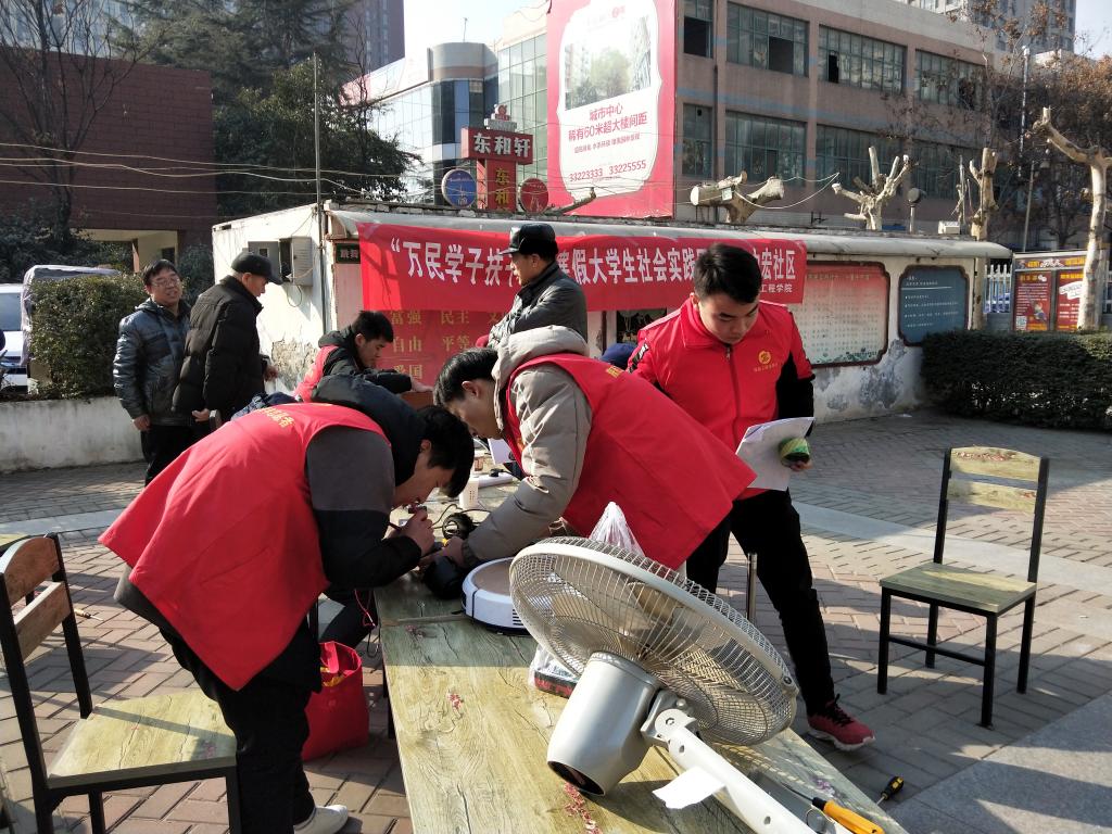 志愿者们秉着学以致用、无私奉献的精神,不畏冬日的严寒,为社区居民带来力所能及的帮助。他们刚抵达中宏社区,便迫不及待接过早已在此等候的居民手中的故障家电开始维修。凭借在校所学到的基本知识,志愿者们逐个检修居民拿来的各种家用电器,并且耐心细致地为居民讲解不同家用电器的使用常识和维修原理,避免再次损坏。经过认真排查、分析、修理、试验,他们最终成功维修烧水器、电饭锅、电风扇、电吹风、豆浆机等多件常用家电。