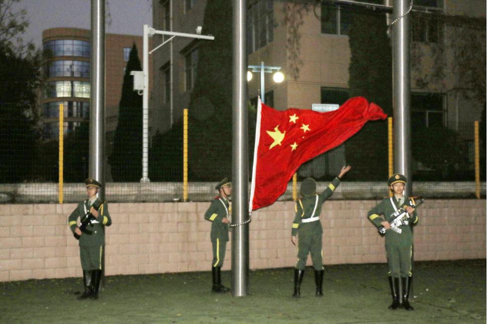 6时50分,升旗仪式开始,国旗班队员们迈着整齐的步伐入场,同学们肃穆而立,在激昂的国歌声中将国旗徐徐升起。