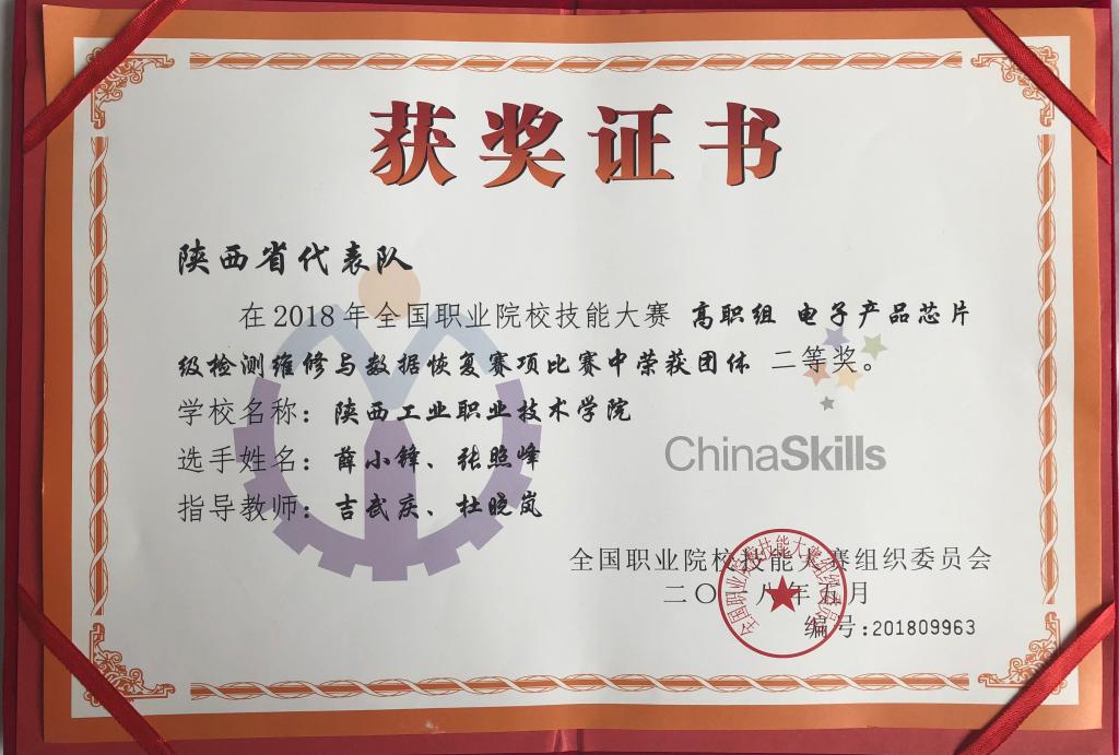 “电子产品芯片级检测维修与数据恢复”赛项国赛获奖证书