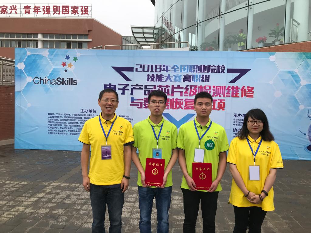 2018年5月9日,2018年全国职业院校技能大赛“电子产品芯片级检测维修与数据恢复”赛项比赛在银川开赛。由电气工程学院教师吉武庆、杜晓岚指导的薛小锋、张照峰两位同学组成的代表队荣获该赛项二等奖。
