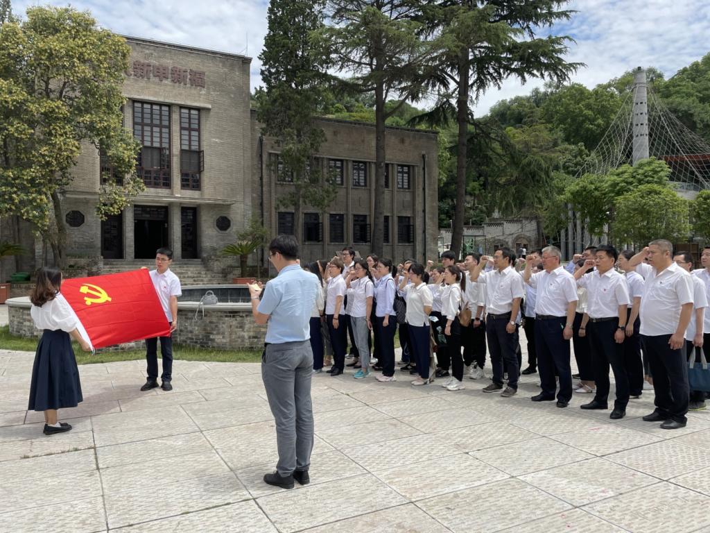在长乐塬抗战工业遗址,党员们走进申新纱厂的窑洞工厂和薄壳厂房,伴随着讲解员的生动讲述,在一幅幅沧桑的历史照片、7纵6横交错的窑洞车间、80多年保存完好的青红砖箍制窑洞、年久的纺织机器与宝钛设备、石油机械井架、航空无人机等“宝鸡制造”现代化工业产品频频驻足。党员们被民族企业家及产业工人的实业救国情怀和革命先烈的英雄事迹、抗战英雄的革命精神而感召,为厚重的老工业积淀而感叹。随后,在长乐塬抗战工业遗址正门前,全体教师党员重温入党誓词,怀着敬仰之情,用洪亮的声音向党旗做出最为庄严的承诺。