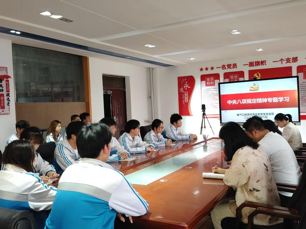 为深入学习贯彻中央八项规定精神,强化学生党员纪律意识与责任担当,5月6日下午,电气学院学生党支部在行知楼A506党员活动室开展深入贯彻中央八项规定精神学习教育,通过观看纪录片、学习原著、研讨交流等形式,推动作风建设入脑入心。