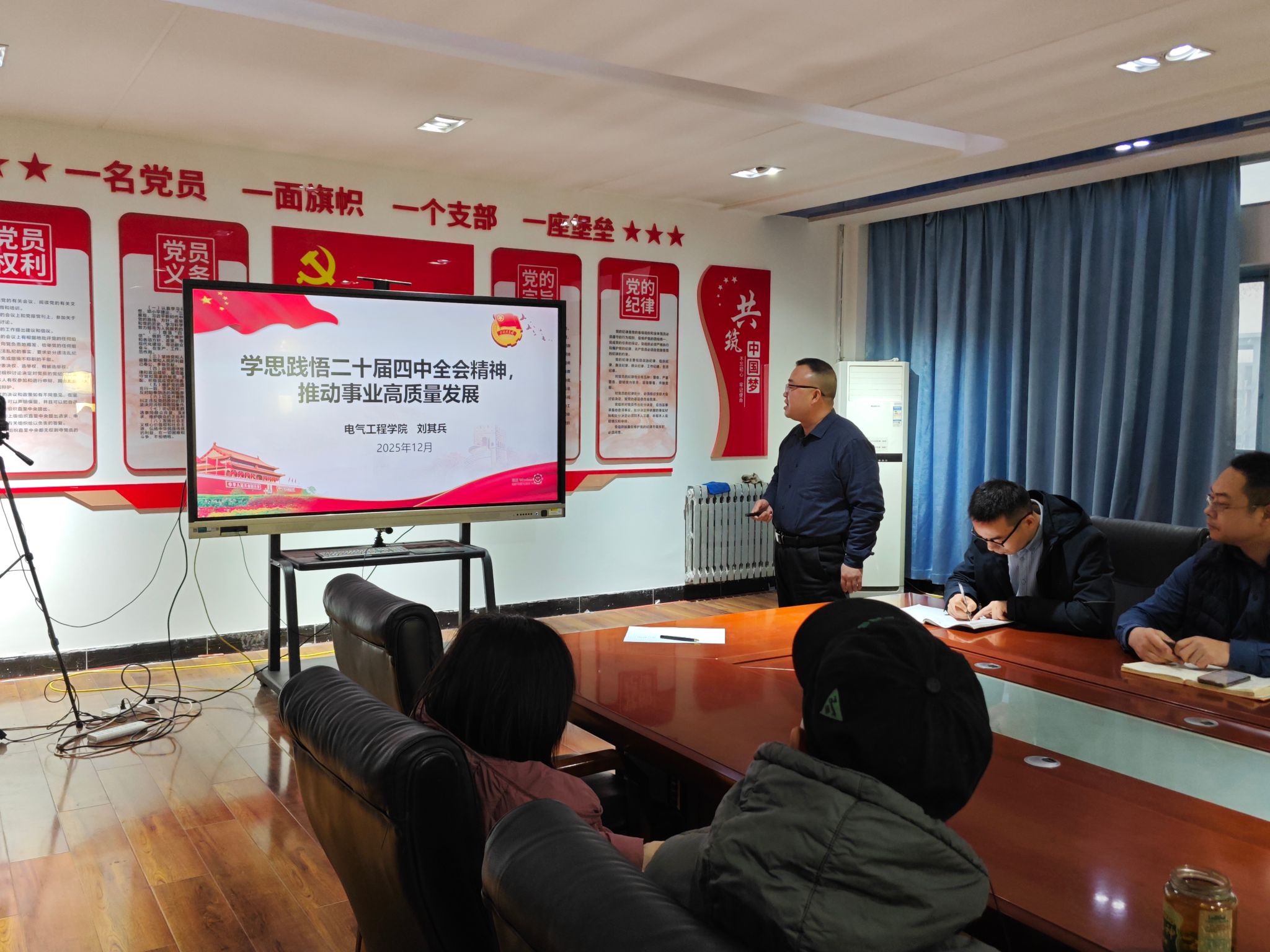 2025年12月31日,电气工程学院党总支在党员活动室举办学习贯彻党的二十届四中全会精神专题党课。本次党课由总支书记刘其兵主讲,围绕全会的历史意义、战略部署与贯彻落实等展开系统讲解。