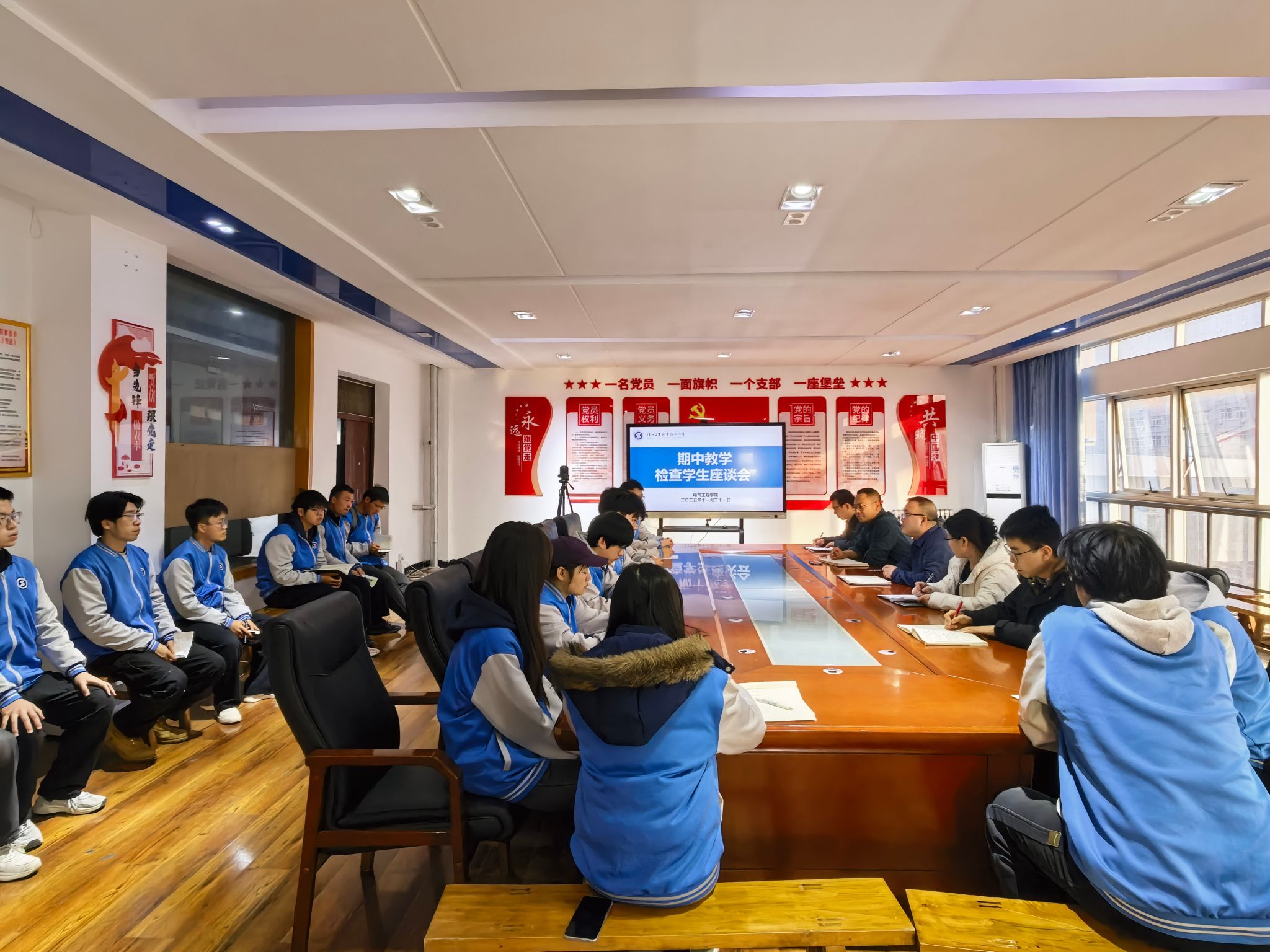 为进一步强化教学管理,全面掌握教育教学运行情况,深入了解学生在学习生活中的问题,11月21日下午,电气工程学院在行知楼A506召开期中教学检查学生代表座谈会,电气工程学院党总支书记刘其兵、副院长董佳辉、教学办、实训中心、学工办和各年级学生代表30余人参加了此次座谈会。